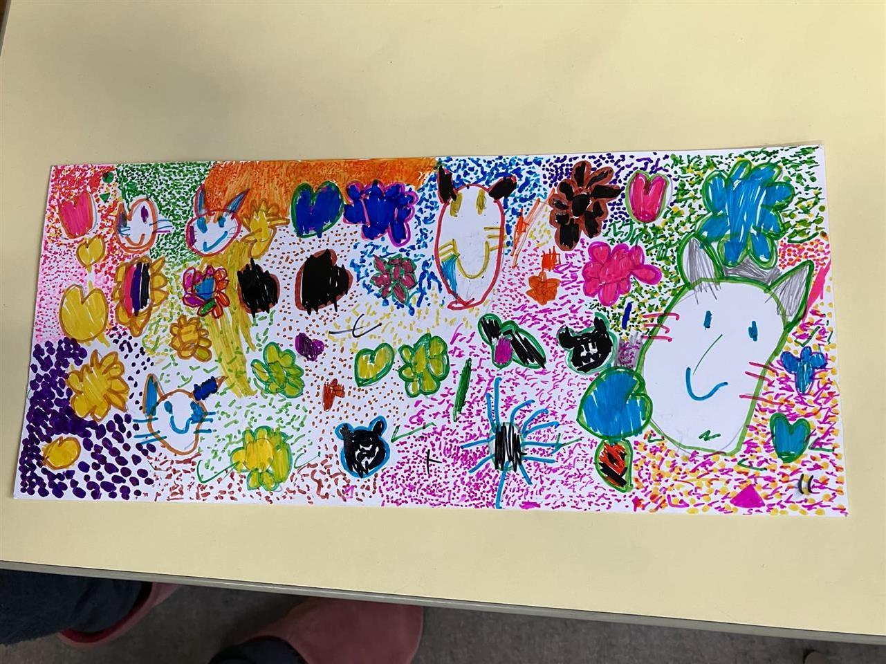 1作目は、年少さんの絵マジックを使いました。とても綺麗きれいです。2作目3作目は、高校2年生支援学校の生徒さん頭で描いて行きます。写真を見ないで描けます。凄い能力です。