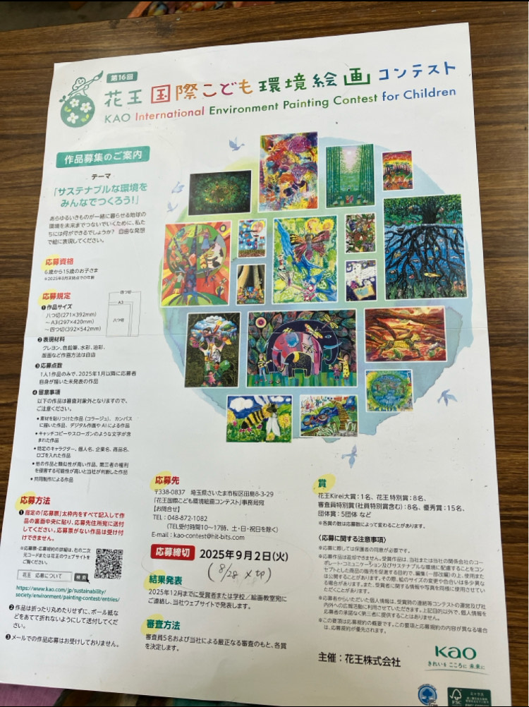 テーマ「サステナブルな環境をみんなでつくろう!」あらゆるいきものが一緒に暮らせる地球の環境を未来までつないでいくために、私たちには何ができるでしょうか?自由な発想で絵に表現してください。応募規定 八つ切(271×392mm)応募締切 2025/8/28